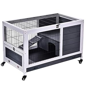PawHut Kaninchenstall aus Holz Hasenstall mit 2 Etagen Freilaufgehege Rädern Klappdach Rampe Tablett, Winterfest Meerschweinchenstall Kleintierstall Kaninchenkäfig für Innen, 91,5 x 53,3 x 73 cm Grau