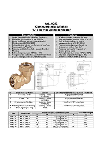 Unser Schraubfitting zugunsten PE Rohre besteht leer hochwertigem Messing UNE EN 12165 nach Legierung CW614N. Das von Genebre patentierte, luftdichte RAC-GE System, bietet maximale Sicherheit zugunsten Verbindungsrohre in Sanitär- und Heizungsinstallationen mit Betriebstemperaturen von -10ºC bis +90ºC.