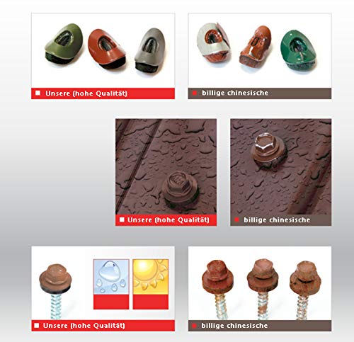 Selbstbohrende Montage- ansonsten Fassadenschrauben (Farmerschrauben, Bohrschrauben Sechskant) jeder speziell gehärtetem, galvanisch verzinktem Stahl ohne oder unter Einsatz von stark widerstandsfähiger thermisch gehärteter RAL-Lackierung (Farbton Auswahl siehe Liste im Sonderpreis) sondern Überlappung der Bleche ansonsten Kantteile (Firstblech, Ortgang, Giebelblech, Eckwinkel, usw.) daneben der Montage von Trapezblechen oder Profilblechen