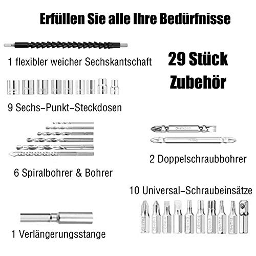 Unser Akkuschrauber ist ein leistungsstarker, praktischer Akku Bohrschrauber mit 29-teiligem Zubehör, der leicht und benutzerfreundlich ist und problemlos getragen werden kann.