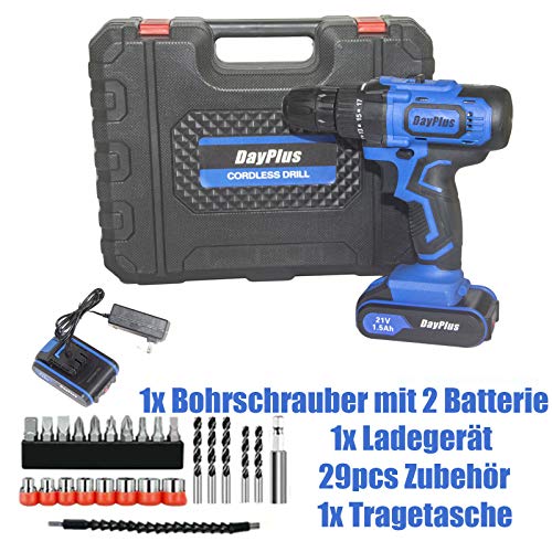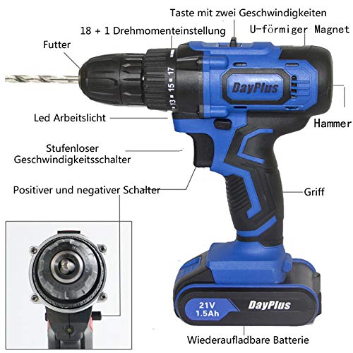 Leistungsstarkes Bohrschrauber-Set: 21-V-Akku-Bohrmaschine mit einer Drehmomenteinstellung von 18 + 1, die eine präzise Steuerung für das Bohren in Stein, Holz, Metall, Kunststoff und alle Schraubaufgaben bietet. Sie sind genug für Sie, um die meiste Ausarbeitung zu abschließen.