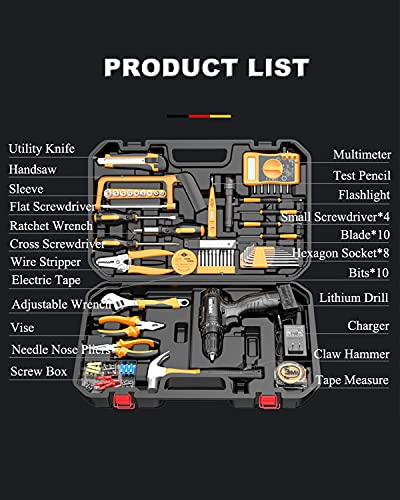 [Multifunktions-Werkzeugkasten] Der 51-teilige Werkzeugkasten enthält eine 25-V-Lithium-Bohrmaschine, ein Universalmesser, eine Handsäge, einen Abisolierer, einen verstellbaren Schraubenschlüssel, ein Multimeter, einen Teststift, ein Maßband und andere Wartungswerkzeuge, abgekoppelt davon, ob es sich um Renovierungsarbeiten oder Gartenarbeiten handelt oder Garage Für Wartungsarbeiten können Sie den Aufkauf eines Werkzeugsatzes als Auftrennung in Betracht ziehen.