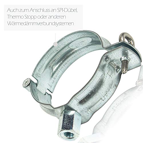 Dank der Gewindemutter lassen sich jedweder möglichen Längen von M8 und M10 Stockschrauben mit der Regenrohrschelle abstrahieren – Alias zum Anschluss an SPI-Dübel, Thermo Stopp oder anderen Wärmedämmverbundsystemen
