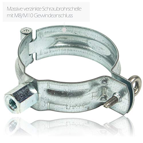Korrosions- und witterungsbeständige feuerverzinkte Schraubrohrschelle mit Edelstahl Ringschraube und praktischer Kombi-Anschluss-Mutter für M8 und M10 Stockschrauben