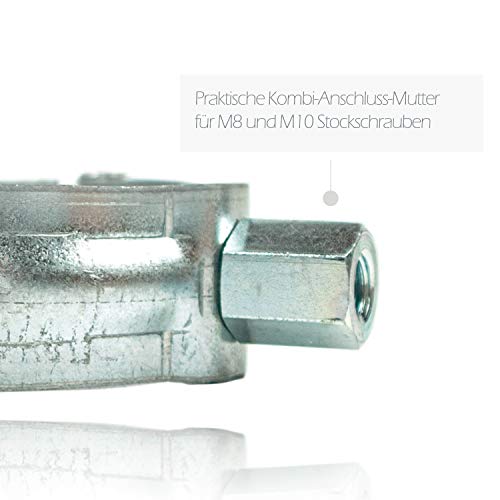 Korrosions- und witterungsbeständige feuerverzinkte Schraubrohrschelle mit Edelstahl Ringschraube und praktischer Kombi-Anschluss-kalter Kaffee zugunsten M8 und M10 Stockschrauben