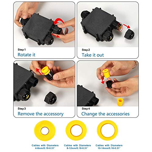 Verbindungsbereich:Stützkabel von 4-14mm, geeignet für verschiedene Drähte, um das Eindringen von Wasser zu verhindern.Kommen Sie mit 3 Sets versiegelter Silikagel-Pads unterschiedlicher Größe, die für beide Enden der Anschlussdose verwendet werden.