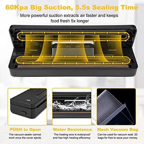 【Kompaktes Design und Einfach zu Bedienen】- Die Vakuumiermaschine hat ungeachtet 4 Tasten, was bequem und schnell zu bedienen ist. Die Vakuumiermaschine bietet eine starke Saugkraft von 0,65 bar, die die gesamte Luft im Vakuumbeutel in 5-10 Sekunden ansaugen kann. Der 30 cm lange Heizstreifen kann den Vakuumbeutel in 6-12 Sekunden perfekt erfüllen. Und verschenken Sie vulgo Vakuum-Schlauch und 20 Vakuumbeutel. Sie müssen kein zusätzliches Zubehör kaufen.