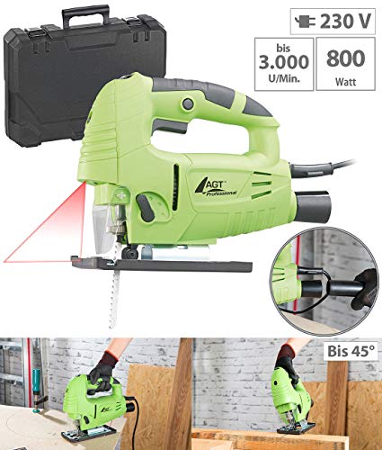 Gerade, runde und Neigungsschnitte bis 45° möglich • Stufenlose Drehzahlregelung bis 3.000 U/Min. • Schnellspann-System für werkzeuglosen Blatt-Wechsel • Zuschaltbarer Laser für gerade Schnitte • Zuschaltbares LED-Licht für bessere Sicht beim Sägen • Staubsauger-Anschluss gegen herumfliegende Späne
