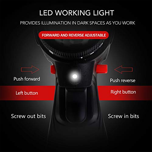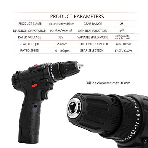 LI-ION-STROM: Das 18-V-Lithium-Ionen-Akku-Bohrset wird mit einem leistungsstarken Li-Ionen-Akku geliefert, der keinen Memory-Effekt, keine Selbstentladung und immer einsatzbereit ist. Ausgestattet mit einem Druckauslöser mit variabler Geschwindigkeit, der Ihren Akku-Bohrer auf eine Leerlaufdrehzahl von 1400 U / min bringen kann, sowie Vorwärts- und Rückwärtshebeln, mit denen der Bohrer schnell zwischen Bohren und Herausziehen von Schrauben Umwandeln kann.