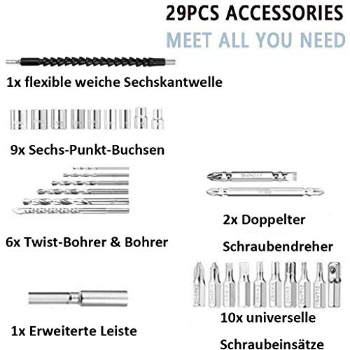 Ergonomisches Design & Persönlichkeit: Auto-Lock-Chuck-Gepräge; mit LED-Licht. Bequemer und weicher Griff und so weiter. 29pcs free drill driver Zubehör: Passt zu Ihren Bedürfnissen und eignet sich zum Bohren von Stein, Wand, Keramikfliesen, Stein, Zement.