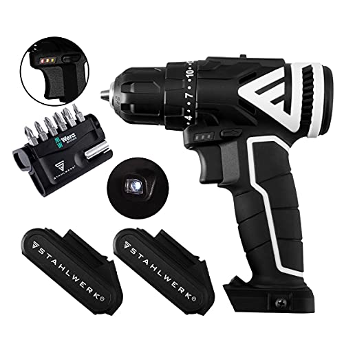 ◆ 2 Batterien und Schnellladung: Ein Funkbohrer, der mit einer Lithium-Ionen-Batterie mit 2 x 1500 mAh ausgestattet ist und 1 Stunde lang schnell aufgeladen werden kann. Wenn eine der Batterien abgelutscht ist, können Sie die Batterie bequem verarbeiten. Eingebautes LED-Licht