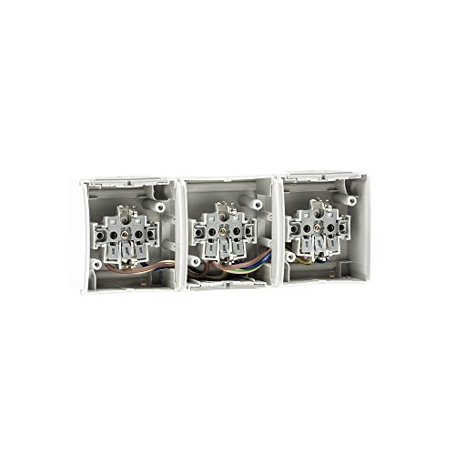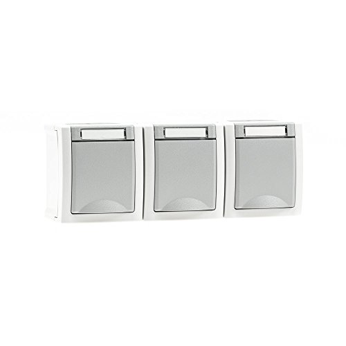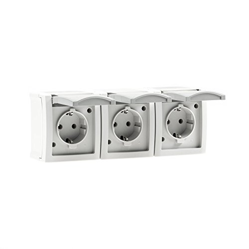 Schuko Steckdose 3-Fach sondern waagerechte Montage. Durch Steckanschluss. Vorverdrahtet Durch 2,5qmm anpassbar. Durch Klappdeckeln. 2P+E, Nennspannung 250V, Nennstrom 16A, Schutzart Aggregat IP54, Schlagfestigkeit IK05