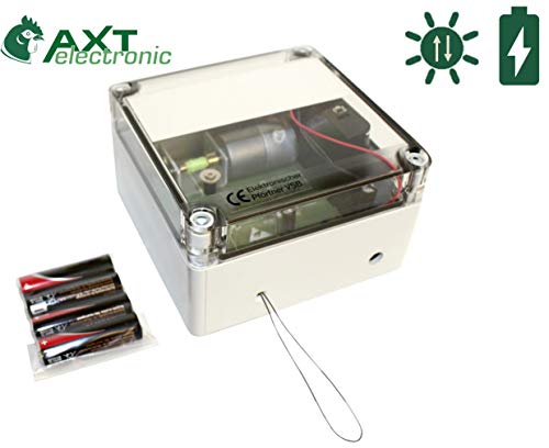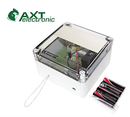 Elektronischer Pförtner VSBb – das Original ! – Batteriebetrieb Lassen Sie Ihren vertikalen Schieber am Geflügelstall automatisch per Dämmerung suffigieren und öffnen. Weltweit im Einsatz, geringer Stromverbrauch, hohe Batterielebensdauer, zuverlässige Positiv, flexible und einfache Montage und Einsatz. – eine Überlastabsicherung verhindert Schäden bei kurzfristigen Blockaden (z.B. angefrorener Schieber) – durch Nutzung von Endschaltern im Anlage keine Gefahr für Tiere die sich unter dem sich schließenden Schieber befinden. Dieser stoppt ganz einfach und schließt weiter, wenn das Tier neuerlich wie weggeblasen ist. – kein Öffnen bei Gewitter (Blitze o.ä.) – Abschirmung der Elektronik durch Speziallack – 2,5kg Gewicht möglich – flexible Montage durch reichhaltig Zubehör möglich Weiteres Zubehör optional erhältlich: – ASb (Außenlichtsensor / externer Sensor) – zur Innenmontage des Gerätes im Stall – BS-D – optionale Zeitschaltuhr, zusätzlich zur Dämmerung, oder ausschließlich per Zeit steuern – HS, mHS, gHS – Schieber+Schienen in drei verschiedenen Größen für die gängigsten Geflügelrassen Varianten und Beispiele zur Montage des Elektronischen Pförtners VSB auf Abfrage. Zu jedem batteriebetriebenen Pförtner erhalten Sie die passenden Alkaline-Batterien (4 Fetzen) dazu.