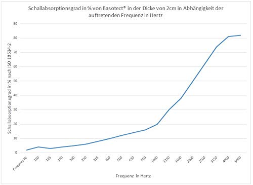 Der Schallabsorptionsgrad dieser 2cm dicken Basotect Absorber liegt bei einer Schallfrequenz von 2000 Herz bei 50% bei 3000 Herz bei 70% und ab 4000 Herz bei 80% und mehr. Basotect Platten welche aka in tiefer frequenten Bereichen einsaugen, finden Sie in unserem Amazon Shop.