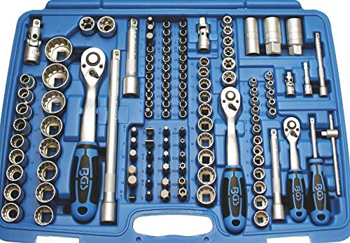 Beinhaltet 3 Ratschen: 6,3 (1/4) + 10 (3/8) + 12,5 (1/2), 176-tlg, + Ratschenschlüssel + Felgennuss + Zündkerzen.