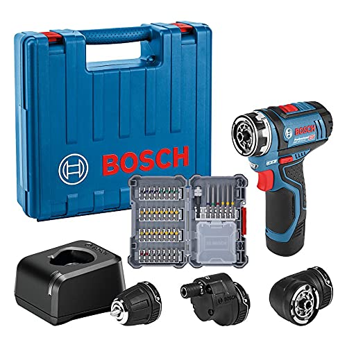 Lieferumfang Amazon Exclusive: GSR 12V-15 FC, 1x Bohrfutteraufsatz, 1x Exzenteraufsatz, 1x Winkelaufsatz, 1x 2,0 Ah Akku, Schnelladegerät, 40tlg. Zubehörset, Handwerkerkoffer