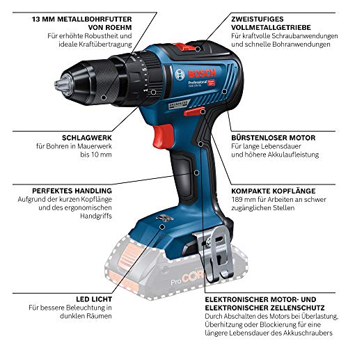 Der Bosch Professional Akkumulator Schlagbohrschrauber GSB 18V-55 überzeugt mit seiner langen Lebensdauer und überdurchschnittlicher Akkulaufzeit dank des leistungsstarken bürstenlosen Motors. Der robuste Bohrschrauber besitzt zudem ein 13 mm Röhm Metallspannbohrfutter, das für zusätzliche Widerstandskraft und eine exzellente Drehmomentübertragung sorgt. Mithilfe der 20+1 Kupplungseinstellungen ist der Schraubvorgang sehr genau und mittels der integrierten Arbeitsleuchte kann selbst unter schwierigen Lichtverhältnissen gearbeitet werden. Der integrierte Gürtelclip sorgt außerdem für einen sicheren Halt und komfortables Bedienen. Das Triebwerk besitzt vulgo ein Zweigang-Metallgetriebe, mit dem Schraub- und Bohrarbeiten schnell und genau ausgeführt werden können.