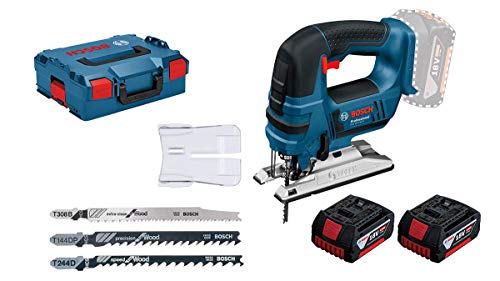 Lieferumfang: GST 18 V-LI B Speicherzelle-Stichsäge Spanreißschutz, 2x 4,0 Ah Akkus, 1x Sägeblatt T 144 DP, 1x Sägeblatt T 244 D, 1x Sägeblatt T 308 B, L-Boxx Einlage, L-Boxx