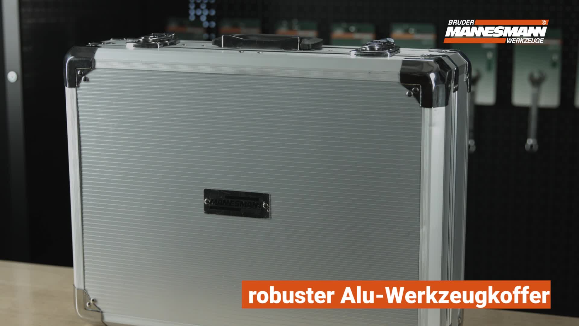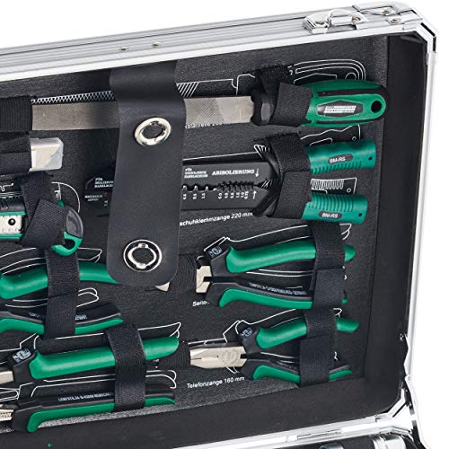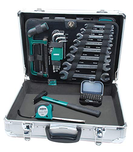 108-teiliger Werkzeugsatz im Alukoffer, bestehenda jeglicher: 30 x Bits, 20 x Steckschl¸sseleins‰tze, 9 x Sechskant- schl¸ssel, 8 x Ringsch¸ssel, 1 x Umschaltknarre, 8 x Schrau- bendreher, 1 x Fäustel, 1 x