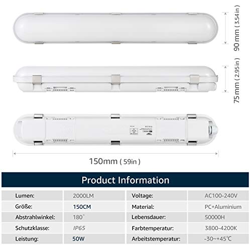 BULING LED Feuchtraumleuchte 150cm 50w 4000K im Reihenschaltung, IP65 LED Werkstattleuchte 4000K Neutralweiß Energieeffizienter als T8 Röhre [Energieklasse A+]
