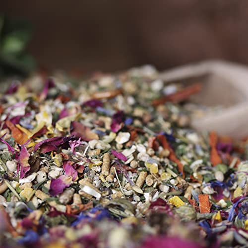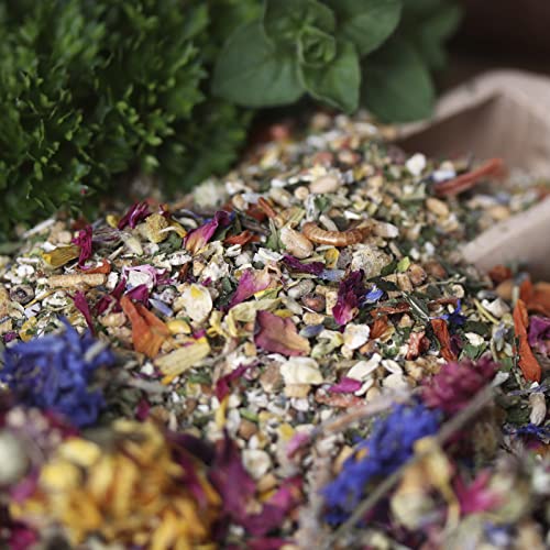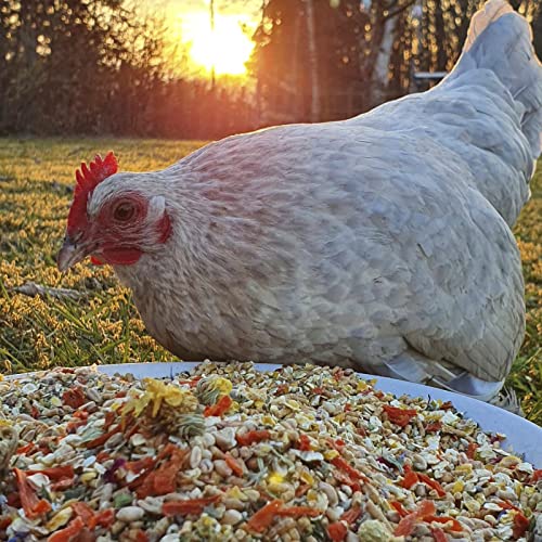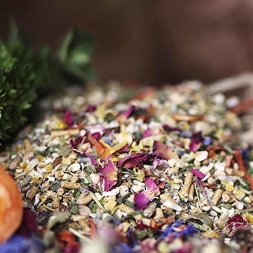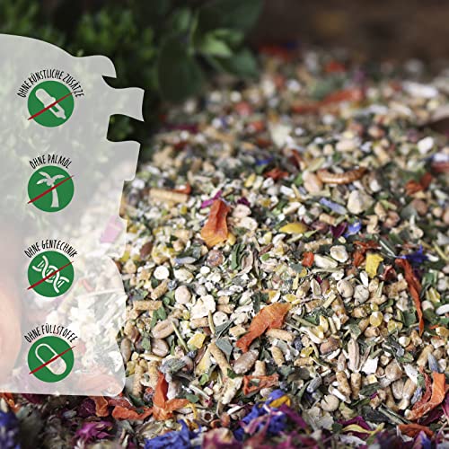 Weizen, Mais, Sojaextraktionsschrotfutter jeglicher geschälter Saat (dampferhitzt, mit Soapstock), Haferflocken, Calciumcarbonat, 3,5% Karottenraspeln*, Petersilienblätter*, Gerste, Weizengrießkleie, Maiskleberfutter, Mineralgrit (Kohlensaurer Muschelkalk, Kohlensaurer Algenkalk, Quarz, Rotstein, Pflanzliche Kohle), 1,5% Leinsaat (extr.), 1,0% Schwarzkümmelsamen, Milokorn, Darisaat, Erbsen, Mehlwürmer*, Kräuter- und Wiesensamen (Weißklee, Esparsette, Rotklee, Perserklee, Schwedenklee, Hornschotenklee, Wiesenrispe, Lieschgras, Gelbklee, Dt. Weidelgras, Rotschwingel, Kümmel, Kl. Wiesenknopf, Dill, Fenchel, Petersilie, Hornschotenklee, Spitzwegerich, Wegwarte, Wilde Möhre, Schafgarbe, Wundklee), Pfefferminzblätter*, Rosmarinblätter*, Oreganoblätter*, Brennnesselblätter*, 0,5% Blütenmischung* (Ringelblumenblüten, Lavendelblüten, Kornblumenblüten, Rotkleeblüten, Kamillenblüten, Rosenblüten), 0,5% Bierhefe, Sonnenblumenkerne, Monocalciumphosphat, Pflanzenöl (Sonnenblumen-, Raps-, Kokos-, Shea), Sonnenblumenextraktionsschrotfutter (mit Soapstock), Natriumchlorid, Natriumbicarbonat. *schonend getrocknet.