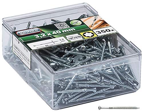PRODUKT-DETAILS: Maschine: Torx | Schrauben-Größe: 3,2 x 40 mm | Kopfform: Senkkopf | Oberfläche: verzinkt | Inhalt: 350 x Dielenschraube, 1 x Bit