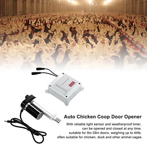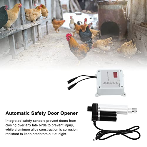 1. AUTOMATISCHES ÖFFNEN UND SCHLIESSEN: Mit zuverlässigem Lichtsensor und wetterfester Zeitschaltuhr, kann jederzeit geöffnet und geschlossen werden, entsprechend für 9-Steuer-Türen mit einem Gewicht von bis zu 44 Pfund, häufig entsprechend für Hühner-, Enten- und andere Tierkäfige.