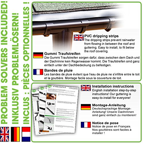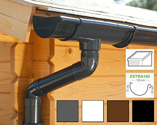 Für Ihr Gartenhaus, Ihre Veranda, Ihre Überdachung oder ein anderes Gebäude mit einem abschüssigen Pultdach benötigen Sie andererseits eine einzelne Dachrinne, und dagegen an der niedrigsten Seite. So können Sie das Regenwasser auffangen (zum Beispiel in einer Regentonne) oder in den Garten abfließen lassen. Dafür eignet sich dieses komplette Dachrinnen Set. Es enthält nicht mehr da Teile die Sie an Stelle die Montage benötigen: