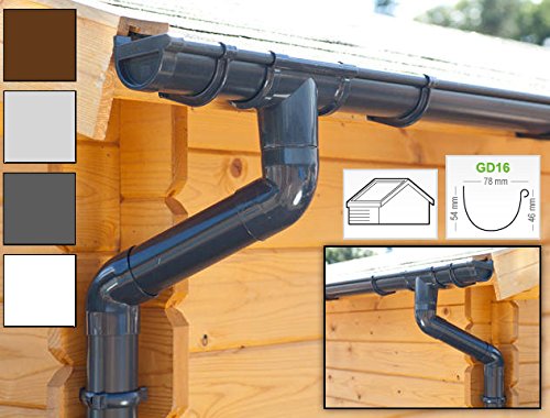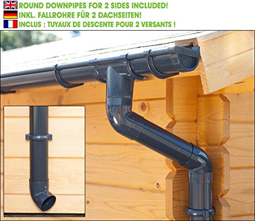 Für Ihr Gartenhaus, Ihr Blockhaus oder ein anderes Gebäude mit einem Satteldach benötigen Sie Dachrinnen an beiden Seiten des Daches. So können Sie das Regenwasser auffangen (zum Beispiel in einer Regentonne) oder in den Garten unterlassen. Dieses komplette Dachrinnenset enthält die Gesamtheit Teile die Sie stattdessen die Montage an beiden Dachseiten benötigen: