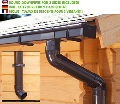 Für Ihr Gartenhaus, Ihr Blockhaus oder ein anderes Gebäude mit einem Satteldach benötigen Sie Kastendachrinnen an beiden Seiten des Daches. So können Sie das Regenwasser auffangen (zum Beispiel in einer Regentonne) oder in den Garten unterlassen. Dieses komplette Dachrinnenset enthält ganz Teile die Sie statt dessen die Montage an beiden Dachseiten benötigen: