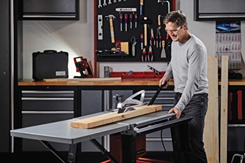 Die Tischverlängerung macht eine einfache Handhabung langer Werkstücke, beispielsweise beim Möbel- oder Konstruktionsbau möglich, wobei diese, um Platz zu sparen, abklappbar ist. Der Parallelanschlag ist einzig abgehärtet und lang für genaue Säumschnitte.