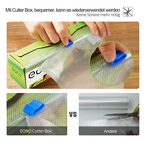 More bequem zu bedienen:Aufgrund der speziellen Cutter-Box-Design, können Sie jede Größe Vakuum versiegelten Beutel frei sensen, keine Schere mehr benötigt.Außergewöhnlich bequem zu bereithalten, wird die Rolle Tasche nicht akzidentell rollen.Die Cutter-Box ist vollständig bequem und ökologisch freundlich