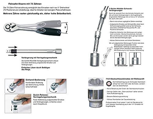 ✔️unter Einsatz von 66-tlg. Steckschlüsselsatz FAMEX 580-SD-16, unter Einsatz von 2 Feinzahnknarren unter Einsatz von 108 Zähnen, Einsätzen unter Einsatz von Wellenprofil auch Rändelung, Verlängerung unter Einsatz von Verriegelungsmechanik, 4 Verlängerungen unter Einsatz von 2-Spezifizieren-Schwenksystem, 25 Bit-Einsätze