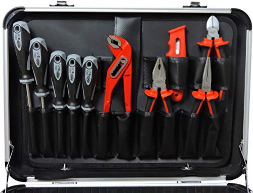 Attraktiver und stabiler Werkzeugkoffer mittels Aussenflächen und Profilen allesamt Leichtmetall (kein wohl alugefärbter Kunststoff), variable Facheinteilung im Kofferboden. Der Koffer bietet Platz zugunsten alternative Werkzeuge und Teile