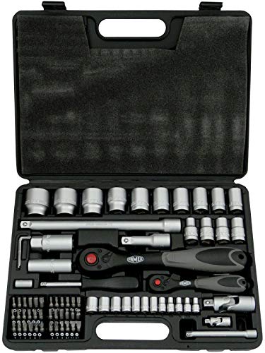 Das Set enthält zudem einen 76-teiligem Steckschlüsselsatz, mittels 2 Knarren mittels 72 Zähnen, Steckschlüsseleinsätze mittels Flanc-Drive Möglichkeit, 4 – 32mm, matt verchromt, Schraub-Bits allesamt Chrom-Vanadium-Molybdän S2-Stahl, in Kunststoffkoffer