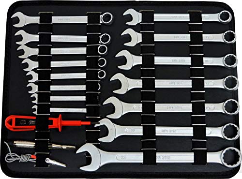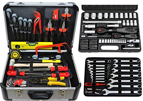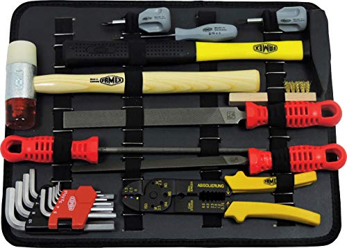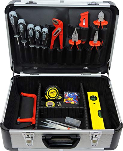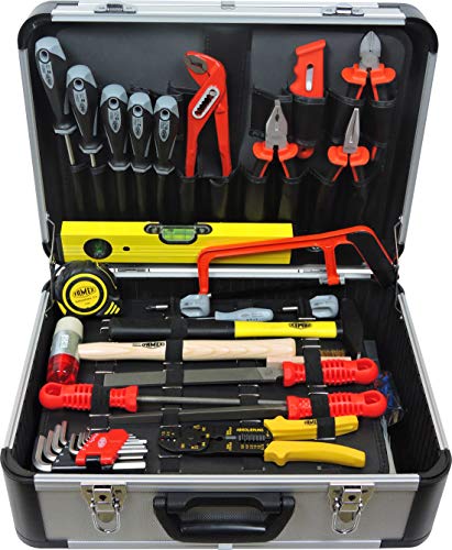 Umfangreiche Werkzeugbestückung: 5 Zangen, 2 Hämmer, 7 Schraubendreher, 15 Gabel-Ringschlüssel 6-22mm, 10 Sechskantschlüssel zugunsten Inbusschrauben, 2 Spannungsprüfer, 3 Glätten, Wasserwaage und mehr