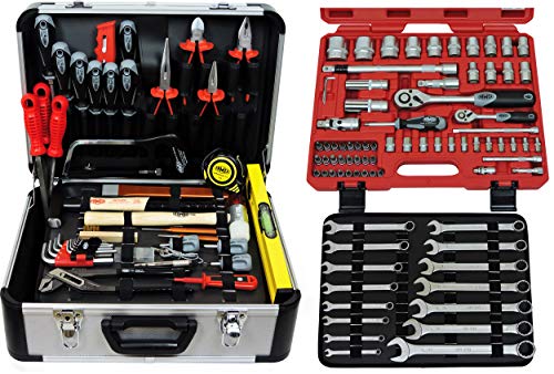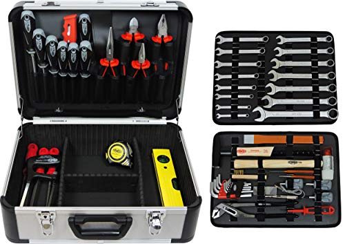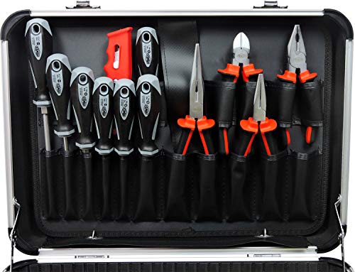 zudem qua Kombizange, 2 Telefonzangen, Seitenschneider qua 2-Komponentengriffen, 15 Gabel-Ringschlüssel 6-22mm (inkl. 15/16/18mm), 3 Glätten, 2 Hämmer, 2 Spannungsprüfer