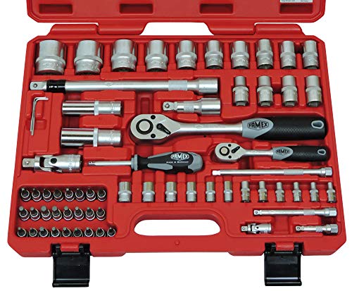 qua 66-tlg. Steckschlüsselsatz FAMEX Nr. 580-SD-20, qua 2 Feinzahnknarren qua 72 Zähnen, Einsätzen qua Wellenprofil weiterhin Rändelung, Verlängerung qua Verriegelungsmechanik, 4 Verlängerungen qua 2-Abstufen-Schwenksystem