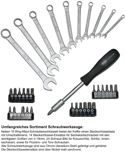 - Neben 10 Ring-Maul-Schraubenschlüsseln bietet der Koffer einen Steckschlüsselsatz mit Umschaltknarre, 14 Steckschlüssel-Einsätze für Sechskantschrauben mit den wichtigsten Größen von 4-19mm, 24 Schraub-Bits für Kreuzschlitz, Schlitz, Innensechskant, sowie für Pozidriv- und Torx-Schrauben. Die Schraub-Bits sind sowohl mit der Knarre, als auch über den Schraubendrehergriff einsetzbar. Alle Schraubwerkzeuge sind aus Chrom-Vanadium-Stahl gefertigt und gehärtet. Die Steckschlüsseleinsätze sind über Nickel matt verchromt.