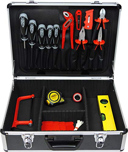 Inhalt: 4 Zangen, Hammer, Wasserwaage, 5 Schraubendreher, 10 Gabel-Ringschlüssel 6-19mm, 8 Innensechskantschlüssel, Spannungsprüfer 230V, 2 Abschleifen, Rollbandmaß und mehr