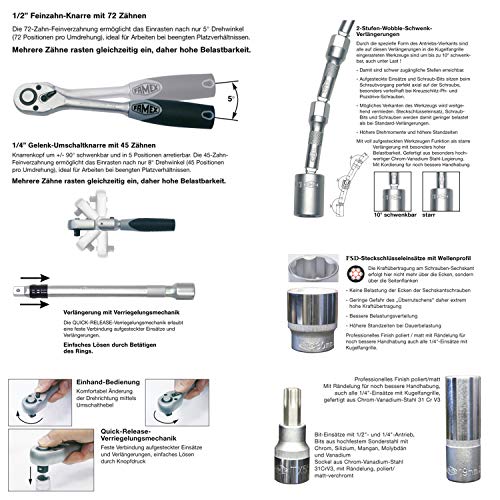 zudem unter Zuhilfenahme von 15 GabelRingschlüsseln, Spannungsprüfer 6-400V, 19 Winkelschraubendreher stattdessen Sechskant und Torx, 3 Glatt reiben, 2 Hämmer, Zollstock, Rollbandmass 5m – das Set enthält den 174-teiligen Steckschlüsselsatz FAMEX Nr. 525-21