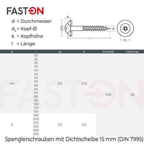 FASTON® Spenglerschrauben POZI 4,5×50 mm Edelstahl A2 V2A (50 Stück) mit Dichtscheibe 15mm ähnl. DIN 7995 Pozidriv…