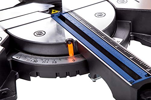 Leicht einstellbare Schnittwinkel; die Schnittwinkel sind ohne Werkzeuge stufenlos einstellbar. Zusätzlich ist es womöglich, voreingestellte Gehrungswinkel auf dem Sägetisch zu verwenden. Schnell und kleinlich Winkel von 0°, 15°, 22,5°, 30° und 45° einstell