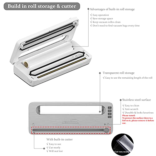 ❥[Einfache und bequeme Bedienung]: Das Automat ist mit einem 30cm breiten Rollenfach ausgestattet, sodass eine Suche nach den Rollen oder den Vakuumbeuteln seltener notwendig ist. Das integrierte Messer bietet Ihnen die Möglichkeit, die Vakuumrollen nach Ihrem Bedarf zuzuschneiden