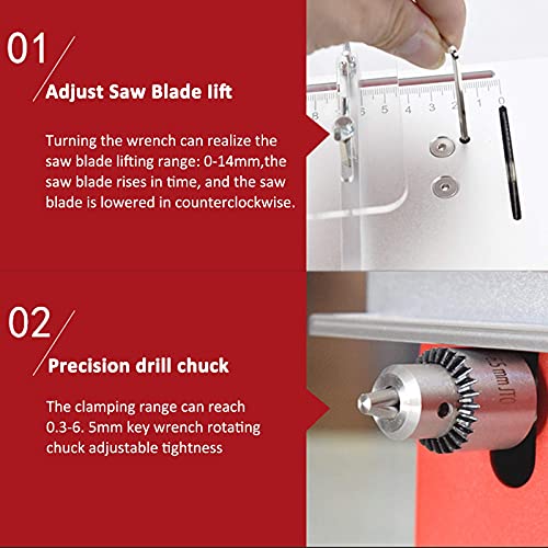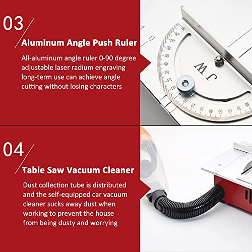 Diese kleine multifunktionale Tischkreissäge verfügt über ein lückenlos geschlossenes Metallgehäuse und eine Vakuumröhre, sodass Sie sich keine Sorgen um Staub machen müssen. Klein und tragbar, Design, robust und langlebig, adäquat zum Herstellen und Mähen kleiner Materialien wie DIY/PCB/Handbuch/Modell