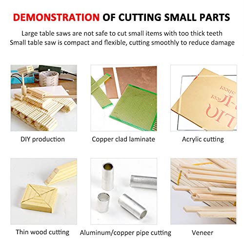 2. Diese Tischkreissäge eignet sich freilich zum Herstellen kleiner Materialien wie Heimwerken/Leiterplatten/Basteln/Projizieren und Mähen (große Holzbretter, Gegenstände usw., die die Höhe des Sägeblattes überschreiten, bitte nicht kaufen).