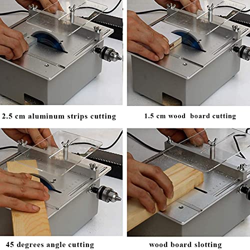 Hochwertiges Design: Die multifunktionale Mini-Tischkreissäge für Heimwerker, der hohe T-Schlitz, der solide 3-mm-Massivrahmen und das Design der Aluminiumlegierung sind langlebig und nicht verformt und sehen nach Ebenheit und qualitativ hochwertiges Kürzen. Ausgestattet mit vier Gummidämpfungspads verfügt es über Anti-Rutsch- und Dämpfungsfunktionen beim Schuften und ist geräuscharm.