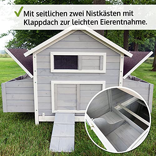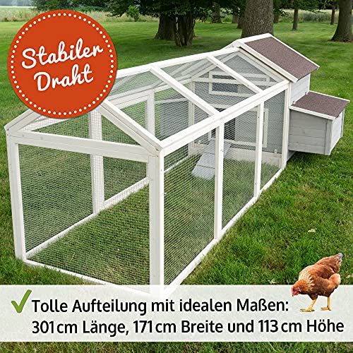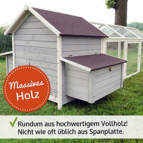 LANGE HALTBARKEIT – Wetterfester Huehnerstall/Hühnerhaus aus hochwertigem Holz. Der Auslauf (Voliere) ist rundum mit starkem, verzinktem Gitter im Rahmen verbaut