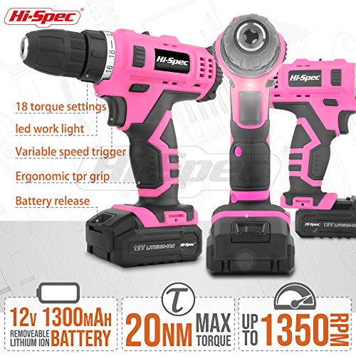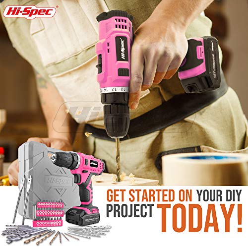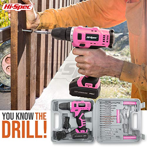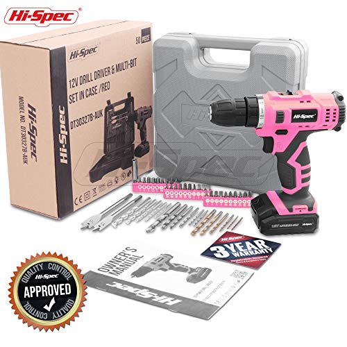 Hi-Spec 50-teiliges Akkubohrmaschinenset mit 12V Bohrer in Pink Rosa und den gebräuchlisten Holz, Metal und…