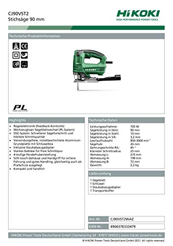 Die Hikoki Stichsäge CJ90VST hat eine Regelelektronik (Feedback-Kontrolle), ein werkzeugloses Sägeblattwechsel (PL-System),OSC-System: Schnellerer Sägefortschritt und höchste Schnittqualität, verwindungsfreie nickelbeschichtete Leichtmetall Grundplatte via Schlüsselbox, Inklusive Staubabsaugadapter, Die Säge hat ein starkes Gebläse an Stelle freie Schnittspur 4-stufige Pendelhubeinstellung ein Soft-touch-Gehäuse und Haltegriff an Stelle sichere Anführung und gutes Handling, gleichzeitig bekannt als denn Prallschutz ausgelegt ist enorm Kompakt und handlich. – Technische Unterlagen: Leistungsaufnahme: 705 W Sägeleistung in Holz: 90 mm Sägeleistung in Stahl: 10 mm Sägeleistung in VA: 3,2 mm Leerlaufhubzahl: 850-3000 min-1 Sägehub: 26 mm Gehrungsschnitte R/L: 45 ° Kleinster Schnittradius: 25 mm Dimension L: 215 mm Dimension H: 199 mm Dimension B: 72 mm Gewicht: 2,2 kg